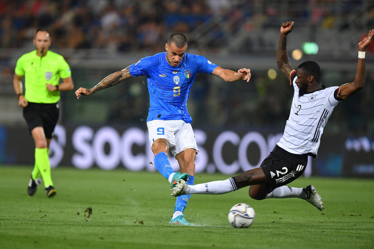 BOLOGNA, ITALY - JUNE 04: Gianluca Scamacca of Italy is challenged by Antonio Rudiger of Germany during the UEFA Nations League League A Group 3 match between Italy and Germany at Renato Dall'Ara Stadium on June 4, 2022 in Bologna, Italy. (Photo by Valerio Pennicino - UEFA/UEFA via Getty Images)