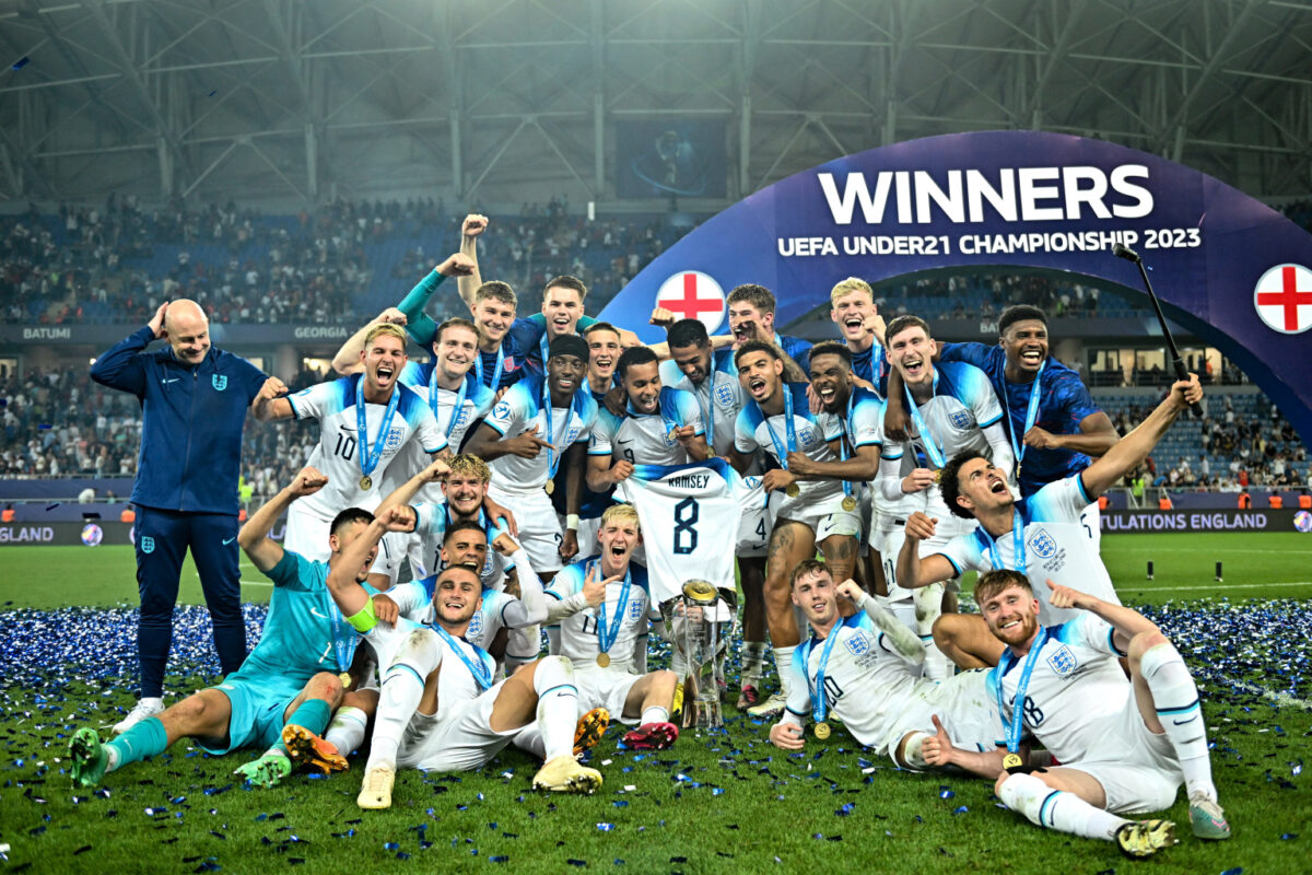BATUMI, GEORGIA - JULY 8: The England team celebrate after their victory in the UEFA Under-21 EURO 2023 Final match between England and Spain at the Batumi Arena on July 8, 2023 in Batumi, Georgia. (Photo by Sam Barnes - Sportsfile/UEFA via Getty Images)