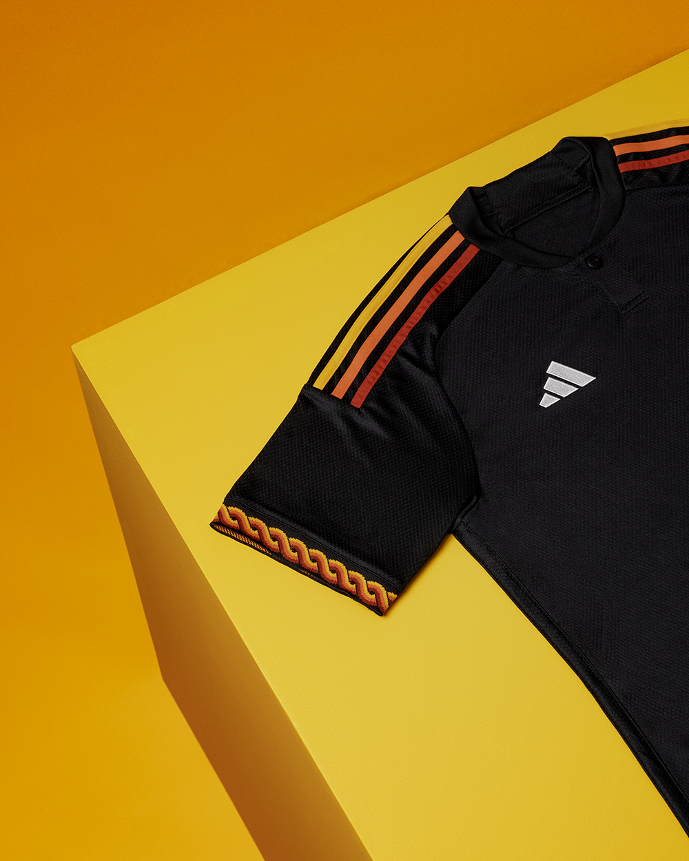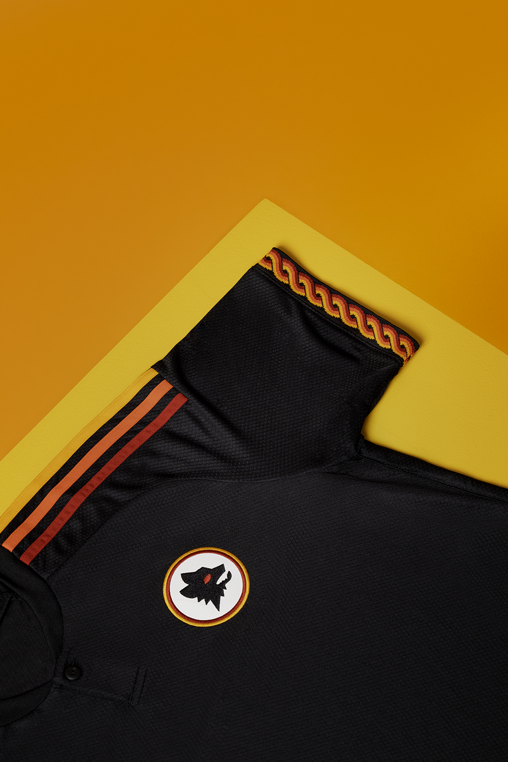 Il design della terza maglia ha come base un elegante colore nero, su cui spiccano alcuni dettagli giallorossi. Sul cuore torna il “Lupetto” della Roma disegnato da Piero Gratton, questa volta in versione nera e inscritto in un cerchio bianco con bordi giallorossi; a destra il logo adidas in versione bianca. Dal colletto in versione “Henry” partono le iconiche tre strisce, che riprendono tre storiche tonalità della società capitolina, il giallo, l’arancione e il rosso. Le maniche, inoltre, sono contraddistinte da un motivo guilloché ispirato agli elementi ornamentali dei mosaici dell’Antica Roma, reinterpretati in chiave contemporanea. Sempre dall’eredità di Gratton viene recuperata la “R” stilizzata, parte dell’identità coordinata del Club all’epoca dell’introduzione del Lupetto. Il logo è posto sul retro-colletto a simboleggiare il raccordo tra la tradizione e il futuro, in questo terzo capitolo dell’”Eternal Future” giallorosso.
