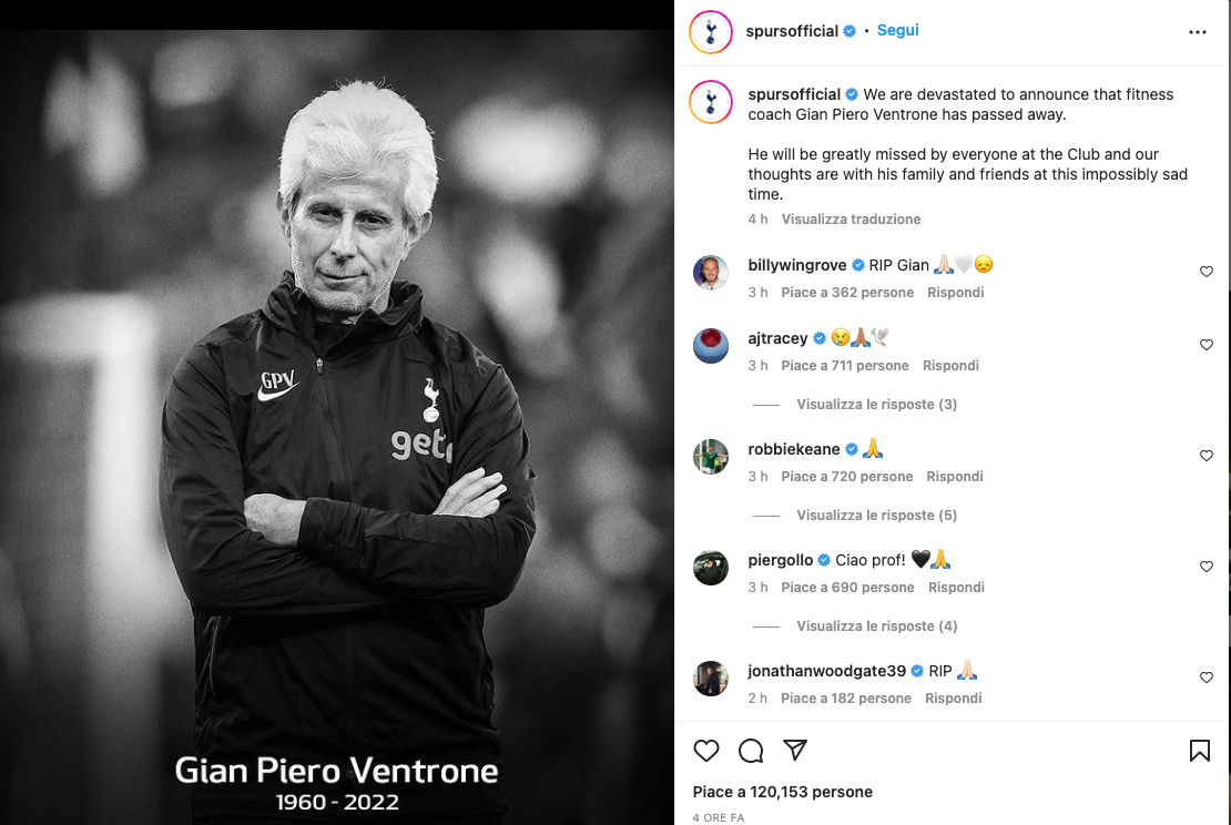 “Siamo devastati nell’annunciare la scomparsa del preparatore atletico Gian Piero Ventrone”. Così il Tottenham, sul proprio sito internet, dà la notizia della scomparsa di un professionista che il tecnico, Antonio Conte, aveva voluto con sè nel novembre del 2021 al suo arrivo sulla panchina degli Spurs. “Amabile fuori dal campo quanto esigente dentro, Gian Piero è diventato rapidamente una figura estremamente popolare tra i giocatori e lo staff – scrive ancora il club londinese -. Mancherà molto a tutti e i nostri pensieri sono con la sua famiglia e i suoi amici in questo momento incredibilmente triste”