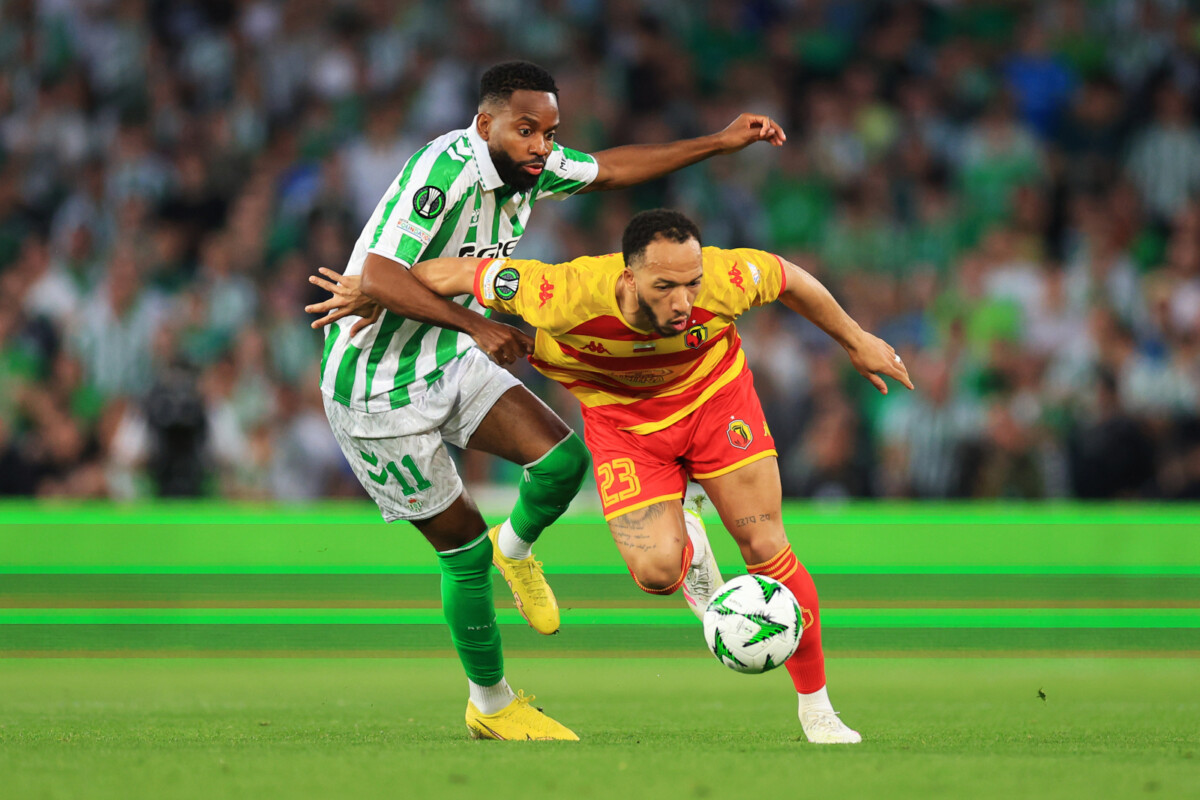 SEVILLE, SPAIN - APRIL 10: Enzo Ebosse of Jagiellonia Bialystok is challenged by Cedric Bakambu of Real Betis during the UEFA Conference League 2024/25 Quarter Final First Leg match between Real Betis Balompie and Jagiellonia Bia?ystok at Estadio Benito Villamarin on April 10, 2025 in Seville, Spain. (Photo by Fran Santiago - UEFA/UEFA via Getty Images)