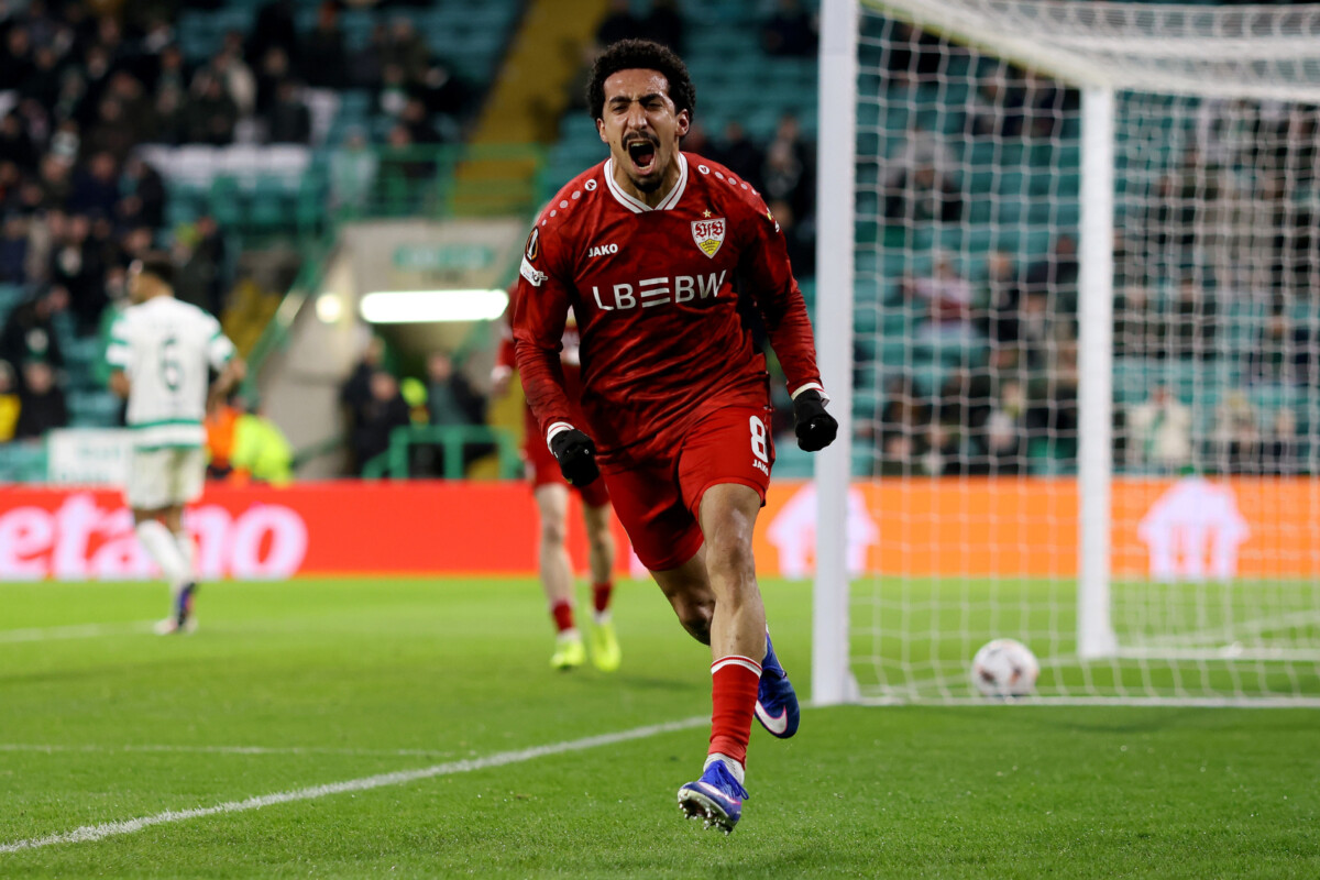 GLASGOW, SCOTLAND - FEBRUARY 19: Tiago Tomas of VfB Stuttgart celebrates scoring his team's fourth goal during the UEFA Europa League 2025/26 Knockout Play-off First Leg match between Celtic FC and VfB Stuttgart at Celtic Park on February 19, 2026 in Glasgow, Scotland. (Photo by Charlie Crowhurst - UEFA/UEFA via Getty Images)